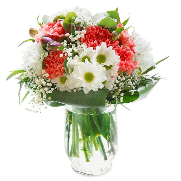 Echoing the sincere warmth of Chessington's community, this bouquet bursts with coral-tinged carnations and spirited red blossoms, their ruffled petals forming a vibrant tapestry at the heart of the arrangement. White daisies, their golden-lime centers gleaming, provide a carefree contrast, evoking the lively energy you might find at a spring fair on Bridge Road. Delicate baby's breath flutters in between, lending a whisper of innocence and softness, while velvet-green leaves encircle the whole, reflecting the lush hedgerows that line local avenues. Just left of center, unopened buds edged with purple peek out, promising the gradual unfolding of new moments and subtle surprises. The entire bouquet is presented upright in a sleek white gift bag with sturdy handles, an easy-to-carry gesture for gifting throughout Chessington and Hook. Lit by soft, even light and set against an all-white background, this arrangement shines with freshness and artistry, making it an inspired choice for commemorating a birthday, anniversary, or simply spreading happiness to someone special in the Chessington area. A luminous bouquet inspired by the vibrant scenes of Chessington's community and open green spaces. Central to this cheerful arrangement are crisp white daisies with vivid green centers, each one radiating a sense of light and new beginnings. Surrounding them, plush coral-pink carnations form soft, ruffled layers, an inviting touch of warmth and exuberance. Clouds of delicate gypsophila lightly interlace the bouquet, adding a sense of movement and airiness, while slender alstroemeria buds bring whispers of purple and blush, hinting at future blossoms. Lush foliage, including soothing eucalyptus and rich dark greens, buoys the floral palette and enhances the bouquet's full, balanced form. Each stem is carefully placed by Chessington's skilled florists, drawing inspiration from local landscapes and the welcoming atmosphere of the neighbourhood. This bouquet is ideal for brightening any day-be it a congratulatory moment, a heartfelt birthday wish, or as a graceful centerpiece for a Chessington family gathering. Its clear, overhead view accentuates every colour and texture, making it a true reflection of artistic floral tradition and contemporary style found in Chessington. This vibrant bouquet exudes the easy elegance of Chessington's neighbourhood charm, its core a lively cluster of coral-pink, ruffled carnations that instantly catch the eye. Around them, crisp white daisies open with yellow-green hearts, sparkling with cheerful innocence and the warmth of sun-drenched afternoons in local parks. Cloud-like sprays of baby's breath are woven throughout, softening the bouquet's silhouette with their delicate touch. Wisps of magenta hint from closed alstroemeria buds, adding gentle flourishes of colour and intrigue. The bouquet's backbone is a lush collar of glossy, broad green leaves at the base, their vitality echoing freshly mown lawns around Chessington World of Adventures. Slender bits of foliage climb upwards among the flowers, enhancing the arrangement's organic appeal. Displayed in a simple clear vase with water, sturdy green stems rise visibly, bathed in balanced natural light, free from harsh shadows. This bouquet feels like an invitation to celebrate life's joyful moments or to comfort a friend, ideally delivered from a Chessington florist to brighten any local table or special occasion.